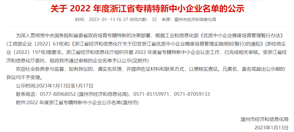 浙江省經(jīng)濟和信息化廳組織開展2022年度省專精特新中小企業(yè)認定工作,已完成相關(guān)審核。近日,溫州市經(jīng)信局公布了2022年度浙江省專精特新中小企業(yè)公示名單,我公司順利通過“浙江省專精特新”中小企業(yè)認定。